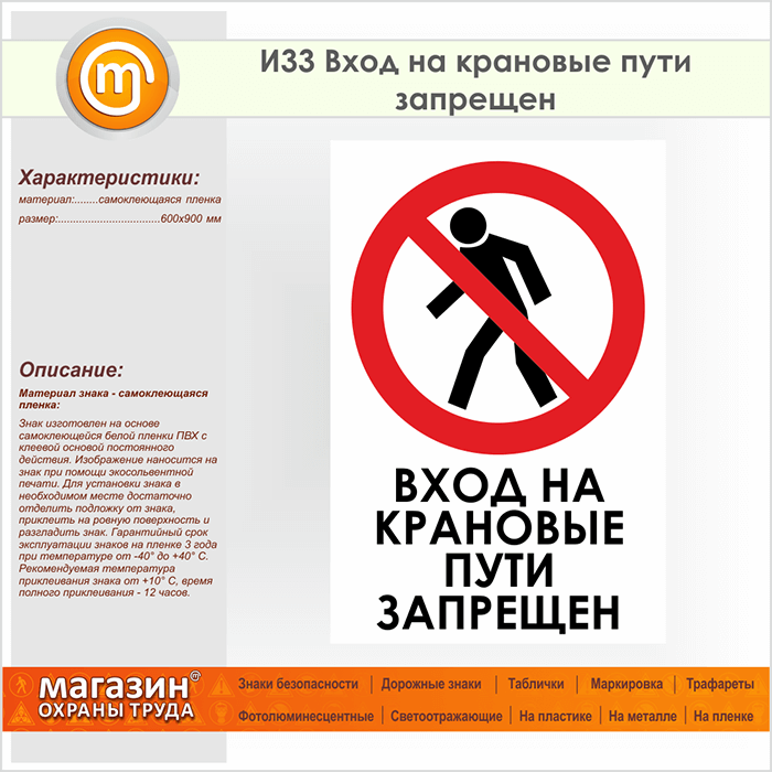 Знак «Вход на крановые пути запрещен», И33 (пленка, 600х900 мм) в Сургуте купить