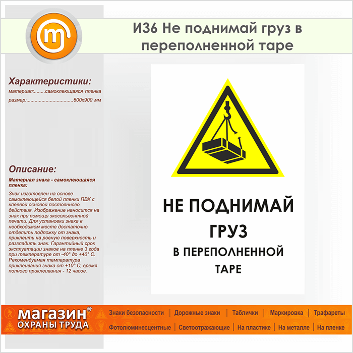 Знак «Не поднимай груз в переполненной таре», И36 (пленка, 600х900 мм) в Сургуте купить