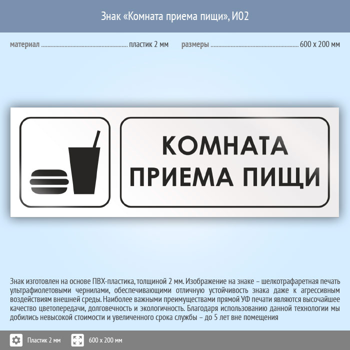 Знак «Комната приема пищи», И02 (пластик, 600х200 мм) в Сургуте купить