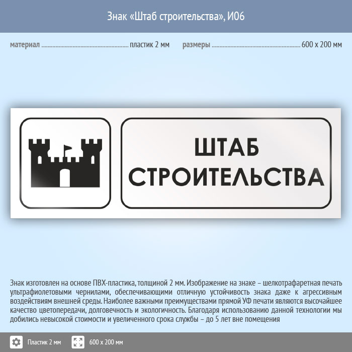Знак «Штаб строительства», И06 (пластик, 600х200 мм) в Сургуте купить