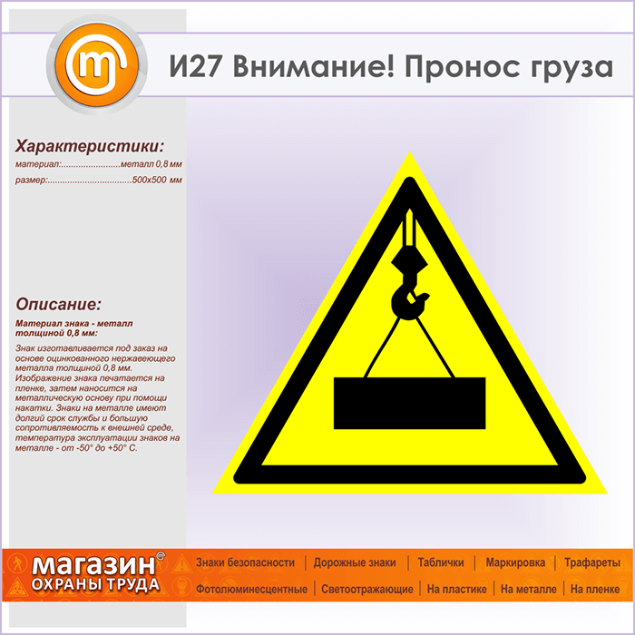 Знак «Внимание! Пронос груза», И27 (металл, сторона 500 мм) в Сургуте купить