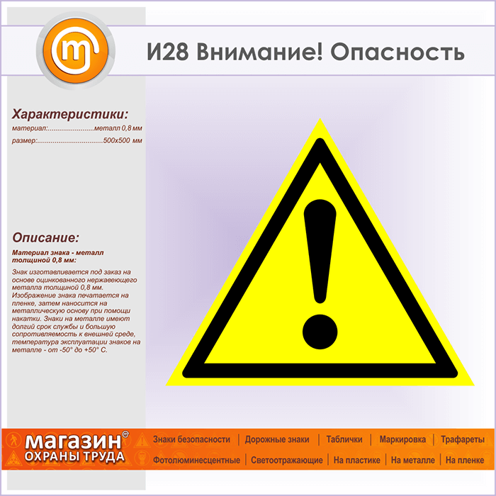 Знак «Внимание! Опасность», И28 (металл, сторона 500 мм) в Сургуте купить