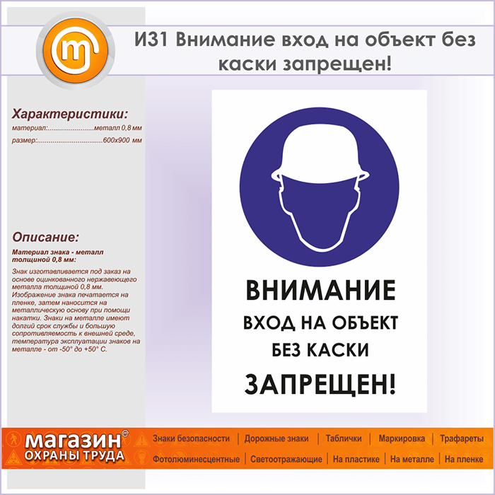Знак «Внимание вход на объект без каски запрещен!», И31 (металл, 600х900 мм) в Сургуте купить