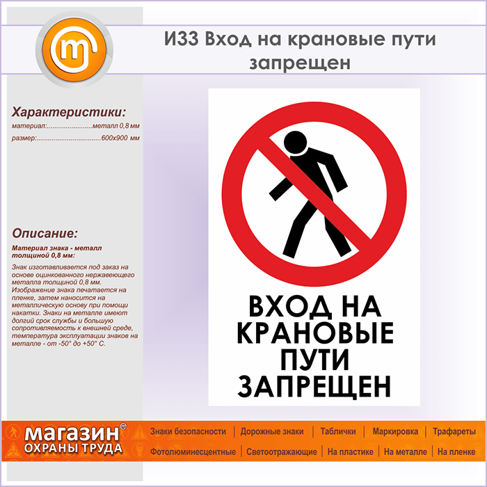 Знак «Вход на крановые пути запрещен», И33 (металл, 600х900 мм) в Сургуте купить