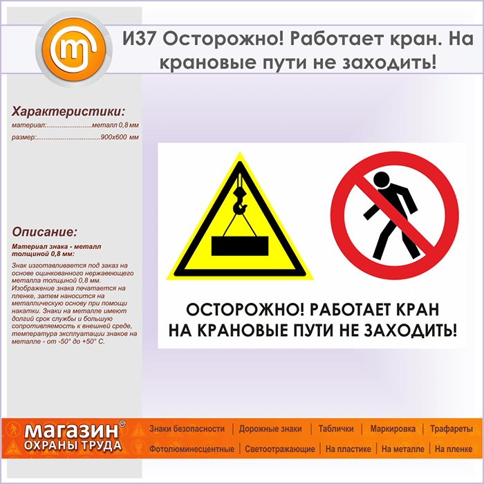Знак «Осторожно! Работает кран. На крановые пути не заходить!», И37 (металл, 900х600 мм) в Сургуте купить
