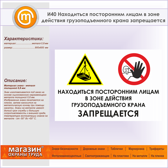 Знак «Находиться посторонним лицам в зоне действия грузоподъемного крана запрещается», И40 (металл, 900х600 мм) в Сургуте купить
