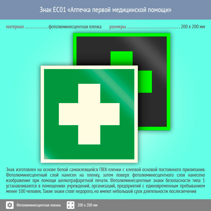 Знак EC01 «Аптечка первой медицинской помощи» (фотолюминесцентная пленка, 200х200 мм) в Сургуте купить