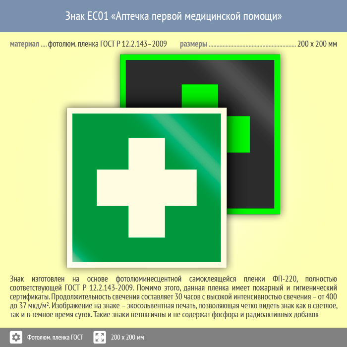 Знак EC01 «Аптечка первой медицинской помощи» (фотолюминесцентная пленка ГОСТ 34428-2018, 200х200 мм) в Сургуте купить