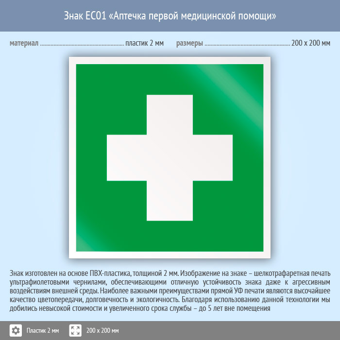 Знак EC01 «Аптечка первой медицинской помощи» (пластик, 200х200 мм) в Сургуте купить