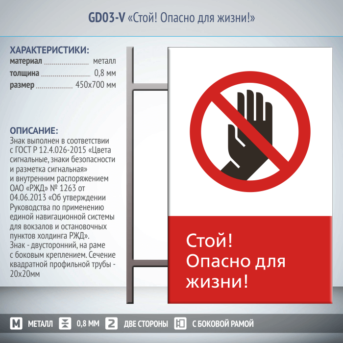Знак «Стой! Опасно для жизни!», GD03-V (двусторонний вертикальный, 450х700 мм, металл, на раме с боковым креплением) в Сургуте купить