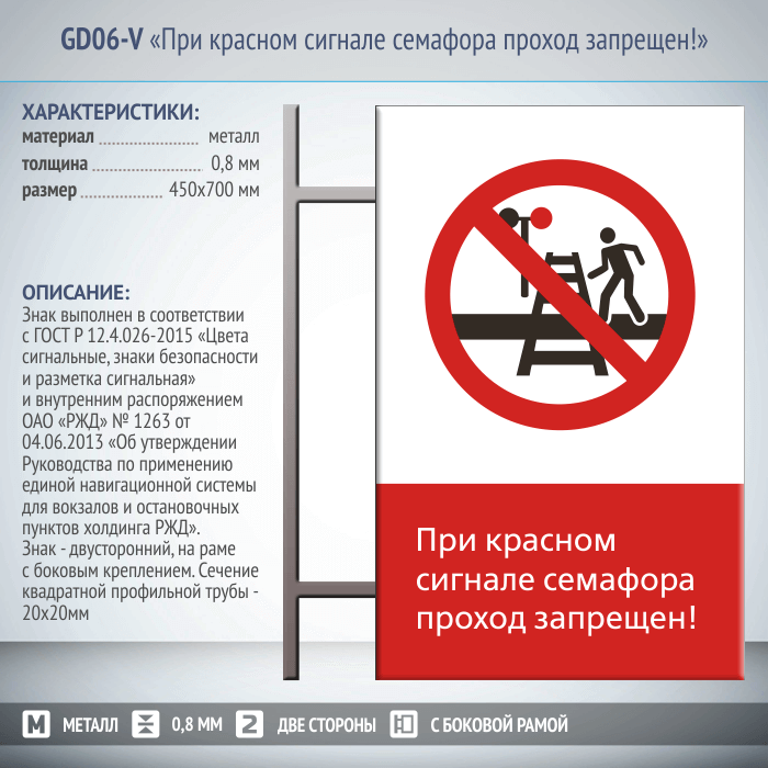 Знак «При красном сигнале семафора проход запрещен!», GD06-V (двусторонний вертикальный, 450х700 мм, металл, на раме с боковым креплением) в Сургуте купить