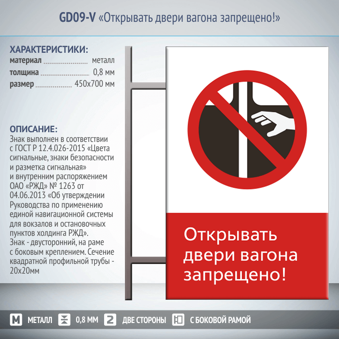 Знак «Открывать двери вагона запрещено!», GD09-V (двусторонний вертикальный, 450х700 мм, металл, на раме с боковым креплением) в Сургуте купить