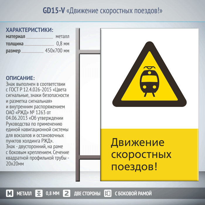 Знак «Движение скоростных поездов!», GD15-V (двусторонний вертикальный, 450х700 мм, металл, на раме с боковым креплением) в Сургуте купить