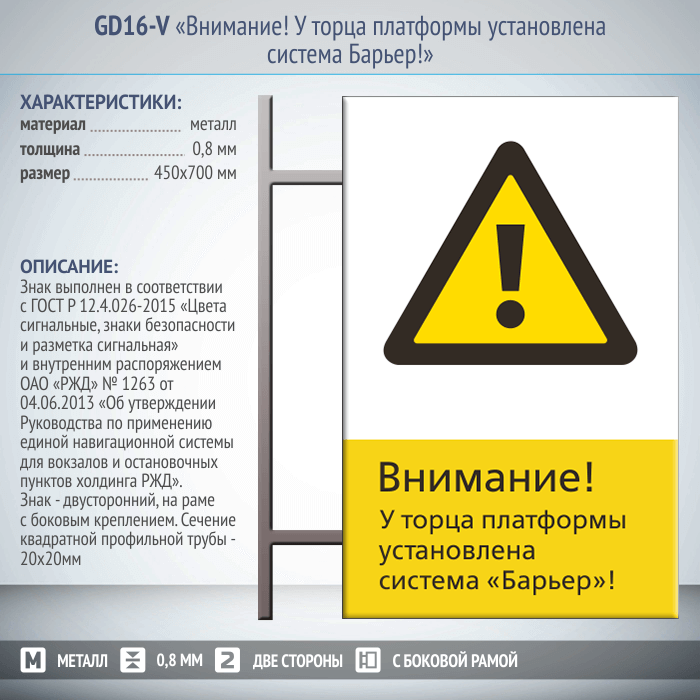 Знак «Внимание! У торца платформы установлена система Барьер!», GD16-V (двусторонний вертикальный, 450х700 мм, металл, на раме с боковым креплением) в Сургуте купить