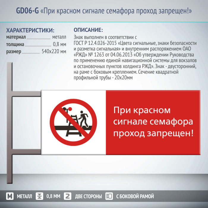 Знак «При красном сигнале семафора проход запрещен!», GD06-G (двусторонний горизонтальный, 540х220 мм, металл, на раме с боковым креплением) в Сургуте купить