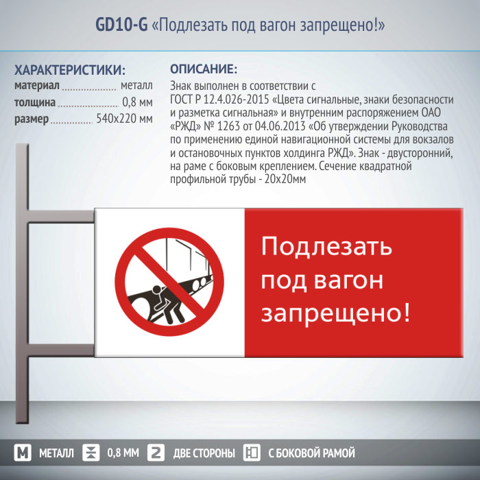 Знак «Подлезать под вагон запрещено!», GD10-G (двусторонний горизонтальный, 540х220 мм, металл, на раме с боковым креплением) в Сургуте купить