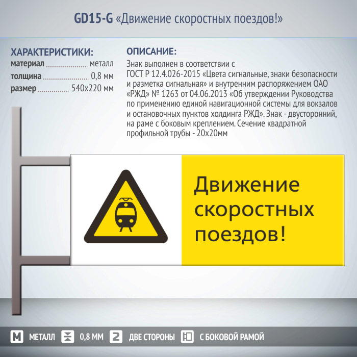 Знак «Движение скоростных поездов!», GD15-G (двусторонний горизонтальный, 540х220 мм, металл, на раме с боковым креплением) в Сургуте купить