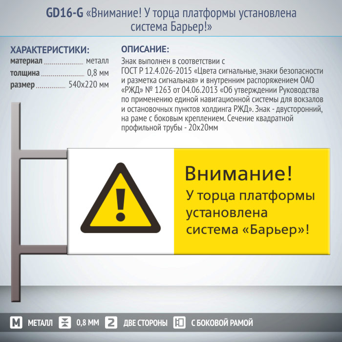 Знак «Внимание! У торца платформы установлена система Барьер!», GD16-G (двусторонний горизонтальный, 540х220 мм, металл, на раме с боковым креплением) в Сургуте купить