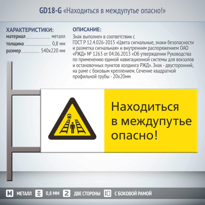 Знак «Находиться в междупутье опасно!», GD18-G (двусторонний горизонтальный, 540х220 мм, металл, на раме с боковым креплением) в Сургуте купить
