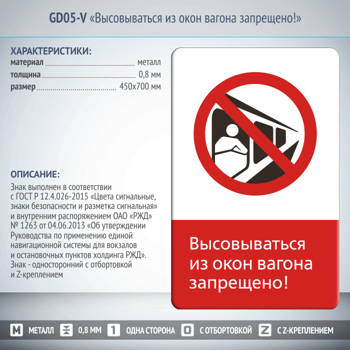 Знак «Высовываться из окон вагона запрещено!», GD05-V (односторонний вертикальный, 450х700 мм, металл, с отбортовкой и Z-креплением) в Сургуте купить
