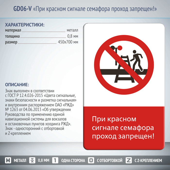 Знак «При красном сигнале семафора проход запрещен!», GD06-V (односторонний вертикальный, 450х700 мм, металл, с отбортовкой и Z-креплением) в Сургуте купить