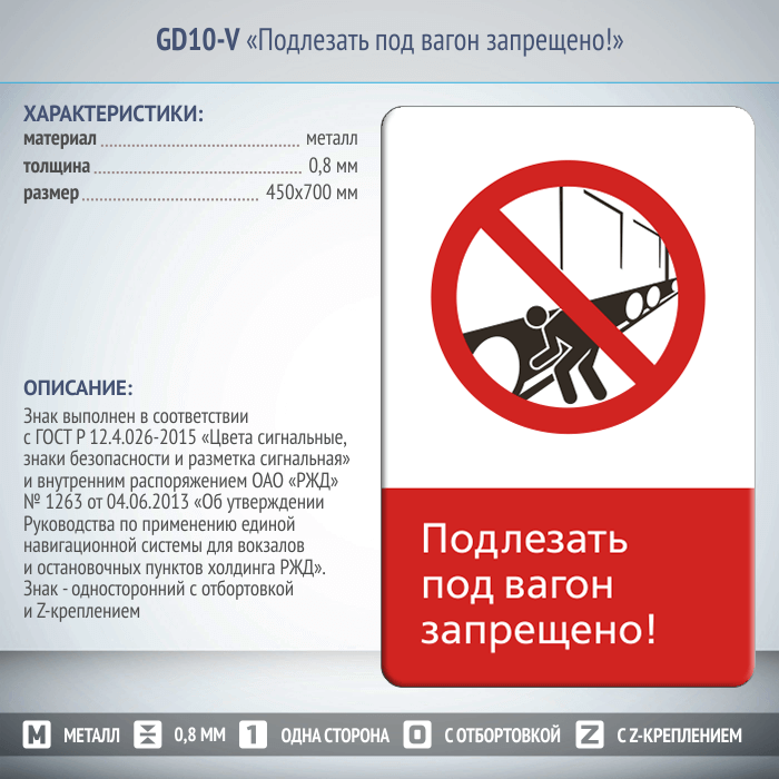 Знак «Подлезать под вагон запрещено!», GD10-V (односторонний вертикальный, 450х700 мм, металл, с отбортовкой и Z-креплением) в Сургуте купить