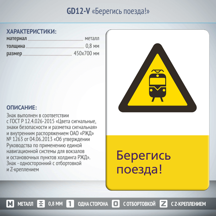 Знак «Берегись поезда!», GD12-V (односторонний вертикальный, 450х700 мм, металл, с отбортовкой и Z-креплением) в Сургуте купить