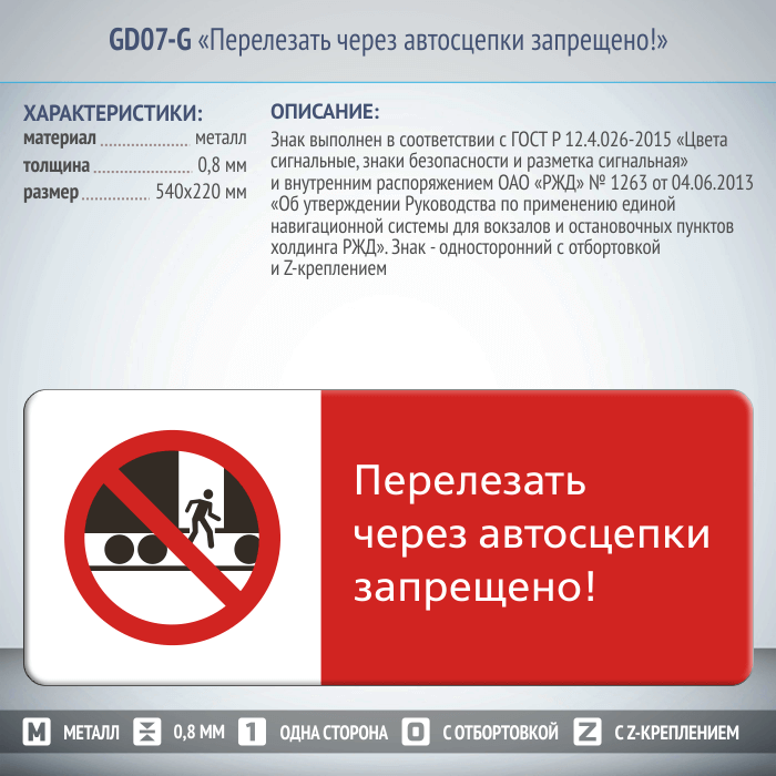 Знак «Перелезать через автосцепки запрещено!», GD07-G (односторонний горизонтальный, 540х220 мм, металл, с отбортовкой и Z-креплением) в Сургуте купить