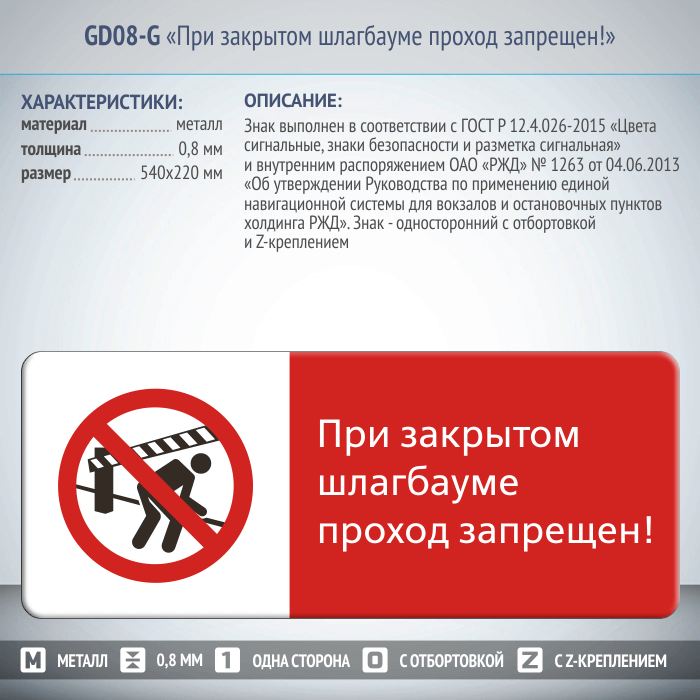 Знак «При закрытом шлагбауме проход запрещен!», GD08-G (односторонний горизонтальный, 540х220 мм, металл, с отбортовкой и Z-креплением) в Сургуте купить