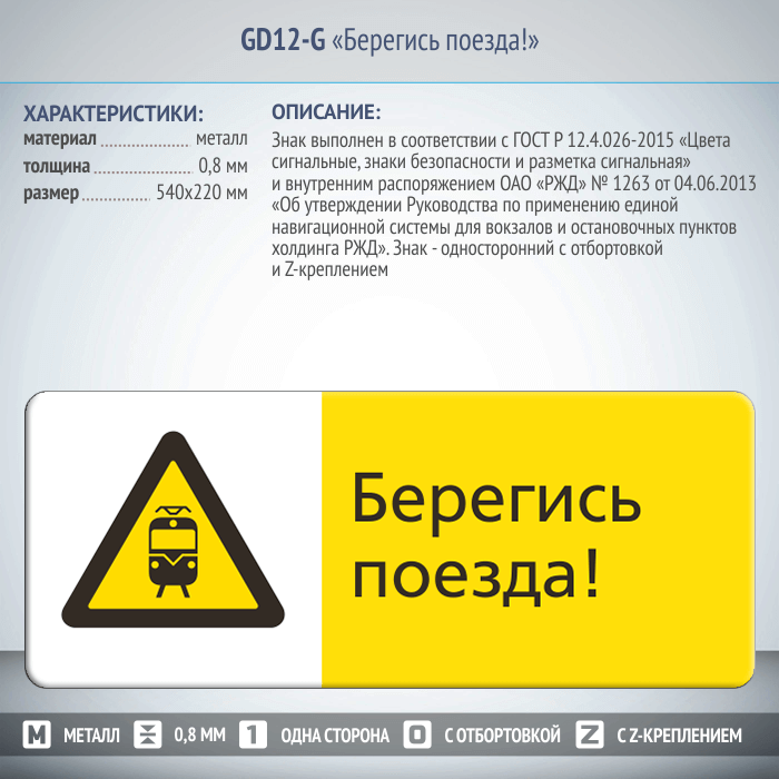 Знак «Берегись поезда!», GD12-G (односторонний горизонтальный, 540х220 мм, металл, с отбортовкой и Z-креплением) в Сургуте купить