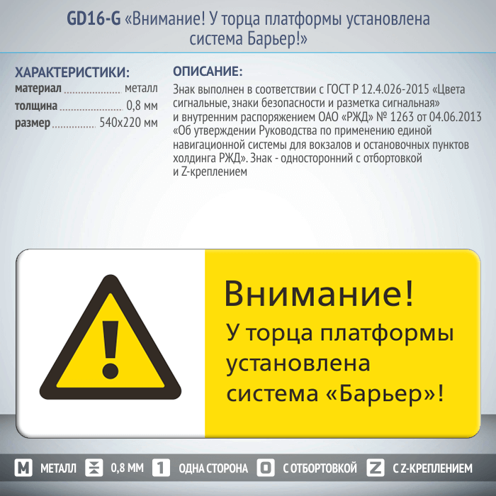Знак «Внимание! У торца платформы установлена система Барьер!», GD16-G (односторонний горизонтальный, 540х220 мм, металл, с отбортовкой и Z-креплением) в Сургуте купить