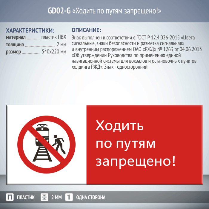 Знак «Ходить по путям запрещено!», GD02-G (односторонний горизонтальный, 540х220 мм, пластик 2 мм) в Сургуте купить