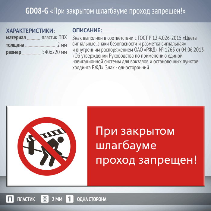 Знак «При закрытом шлагбауме проход запрещен!», GD08-G (односторонний горизонтальный, 540х220 мм, пластик 2 мм) в Сургуте купить