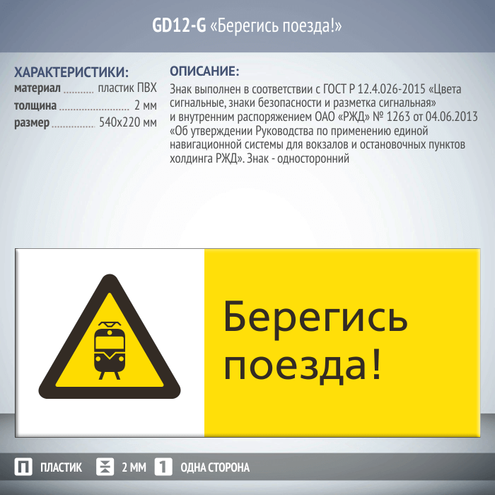 Знак «Берегись поезда!», GD12-G (односторонний горизонтальный, 540х220 мм, пластик 2 мм) в Сургуте купить