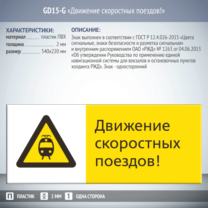 Знак «Движение скоростных поездов!», GD15-G (односторонний горизонтальный, 540х220 мм, пластик 2 мм) в Сургуте купить