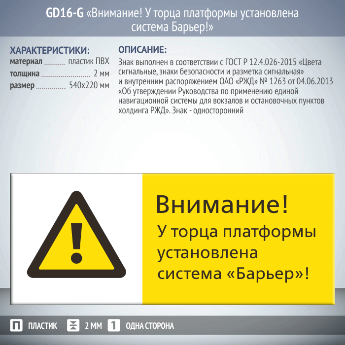Знак «Внимание! У торца платформы установлена система Барьер!», GD16-G (односторонний горизонтальный, 540х220 мм, пластик 2 мм) в Сургуте купить