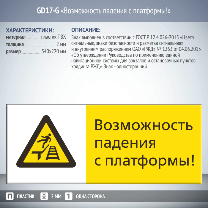 Знак «Возможность падения с платформы!», GD17-G (односторонний горизонтальный, 540х220 мм, пластик 2 мм) в Сургуте купить