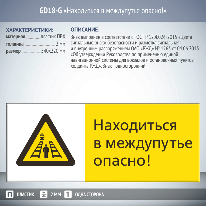 Знак «Находиться в междупутье опасно!», GD18-G (односторонний горизонтальный, 540х220 мм, пластик 2 мм) в Сургуте купить