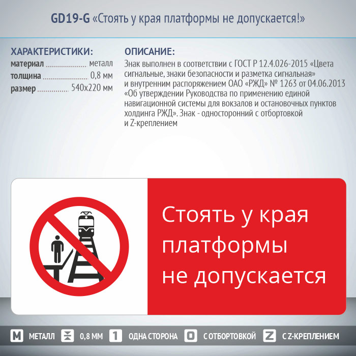 Знак «Стоять у края платформы не допускается!», GD19-G (односторонний горизонтальный, 540х220 мм, металл, с отбортовкой и Z-креплением) в Сургуте купить