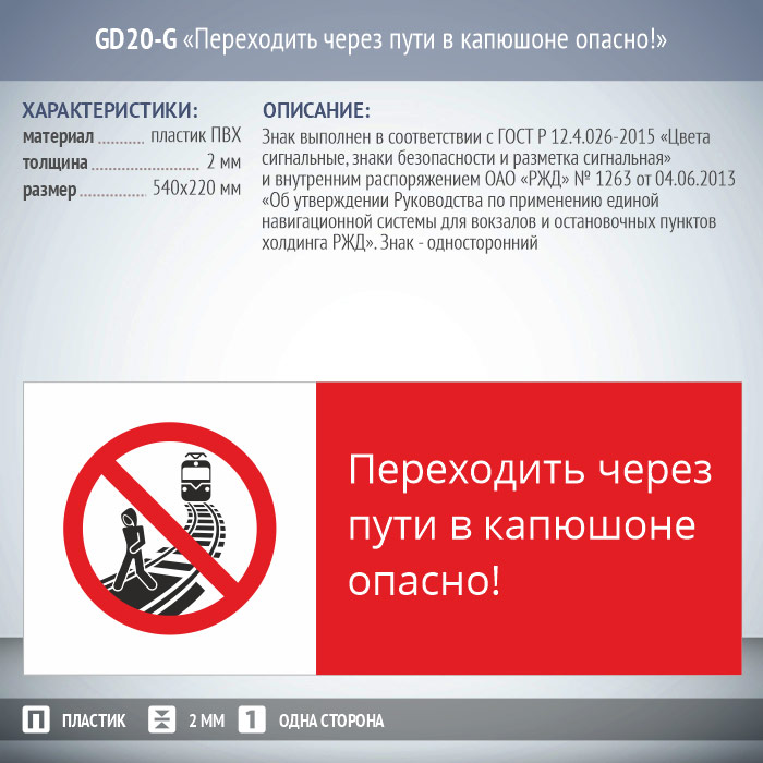 Знак «Переходить через пути в капюшоне опасно!», GD20-G (односторонний горизонтальный, 540х220 мм, пластик 2 мм) в Сургуте купить