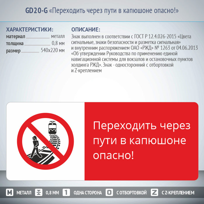 Знак «Переходить через пути в капюшоне опасно!», GD20-G (односторонний горизонтальный, 540х220 мм, металл, с отбортовкой и Z-креплением) в Сургуте купить