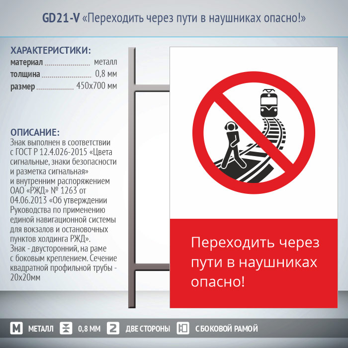 Знак «Переходить через пути в наушниках опасно!», GD21-V (двусторонний вертикальный, 450х700 мм, металл, на раме с боковым креплением) в Сургуте купить