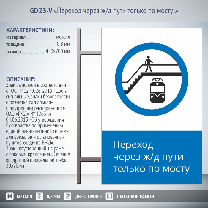 Знак «Переход через ж/д пути только по мосту!», GD23-V (двусторонний вертикальный, 450х700 мм, металл, на раме с боковым креплением) в Сургуте купить