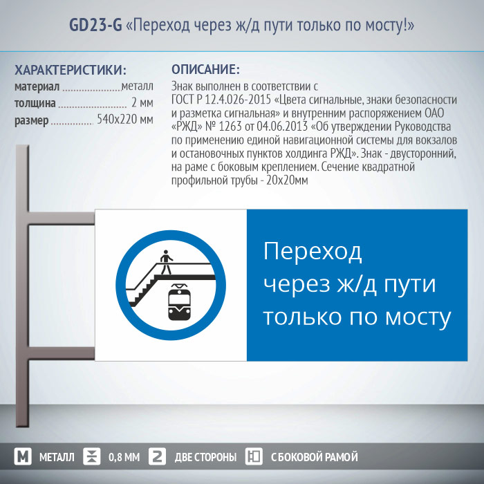 Знак «Переход через ж/д пути только по мосту!», GD23-G (двусторонний горизонтальный, 540х220 мм, металл, на раме с боковым креплением) в Сургуте купить