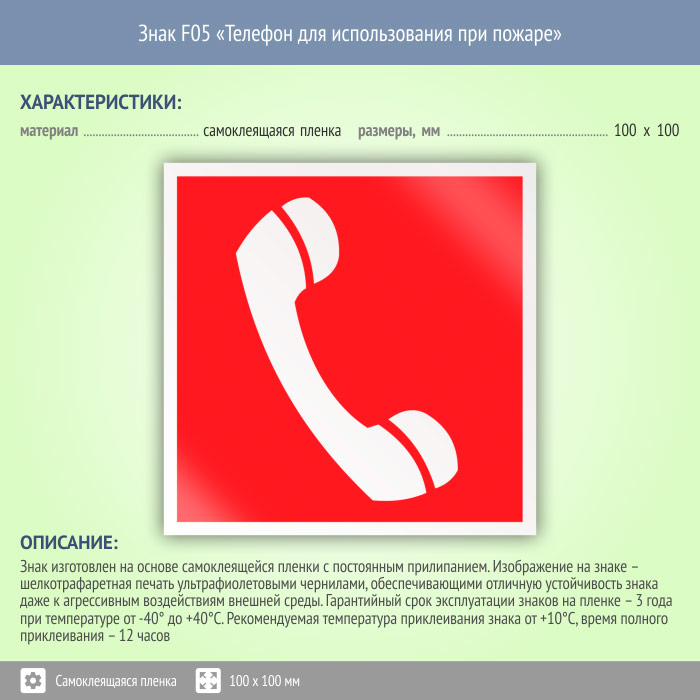 Знак F05 «Телефон для использования при пожаре (в том числе телефон прямой связи с пожарной охраной)» (пленка, 100х100 мм) в Сургуте купить