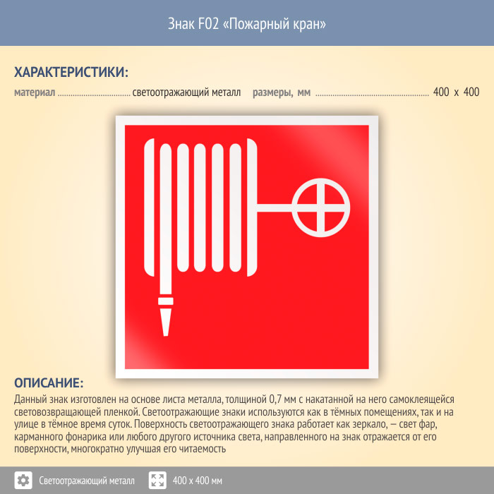 Знак F02 «Пожарный кран» (светоотражающий металл, 400х400 мм) в Сургуте купить