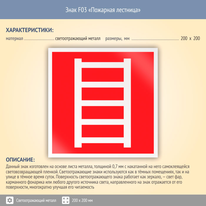 Знак F03 «Пожарная лестница» (светоотражающий металл, 200х200 мм) в Сургуте купить