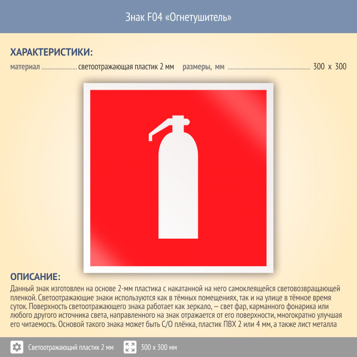 Знак F04 «Огнетушитель» (светоотражающий пластик, 300х300 мм) в Сургуте купить