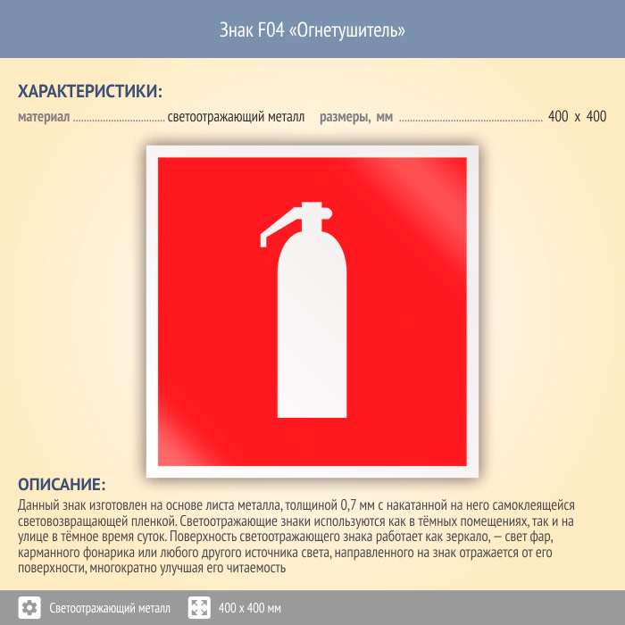Знак F04 «Огнетушитель» (светоотражающий металл, 400х400 мм) в Сургуте купить