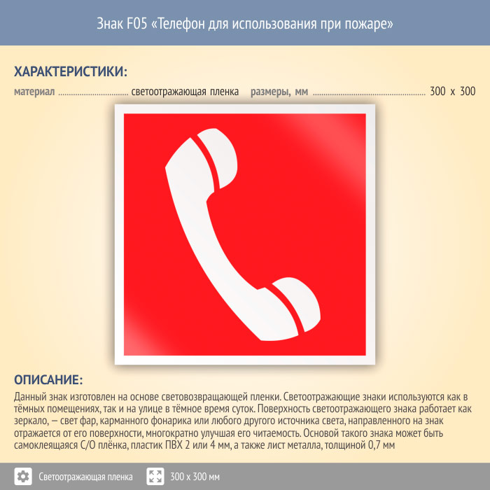 Знак F05 «Телефон для использования при пожаре (в том числе телефон прямой связи с пожарной охраной)» (светоотражающая пленка, 300х300 мм) в Сургуте купить